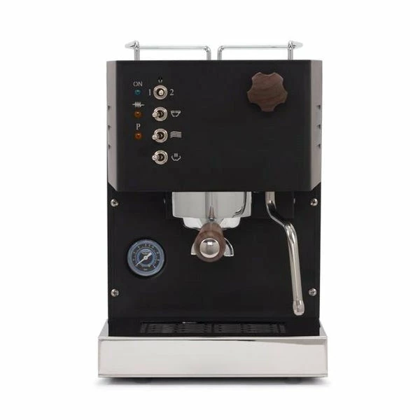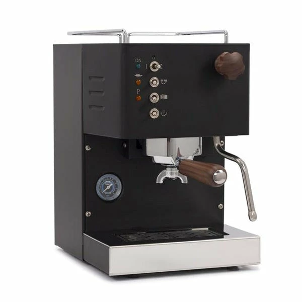 Embrace the elegance of the Quickmill Pippa, an exquisite addition to any kitchen or coffee nook. Available in stainless steel and matte black variations, each comes with a steam knob and portafilter featuring either black or wooden accents. The machined icons on the panel exude a premium feel, and a sleek railing on the cup warmer adds both distinction and practicality, preventing cups from being accidentally knocked off.
