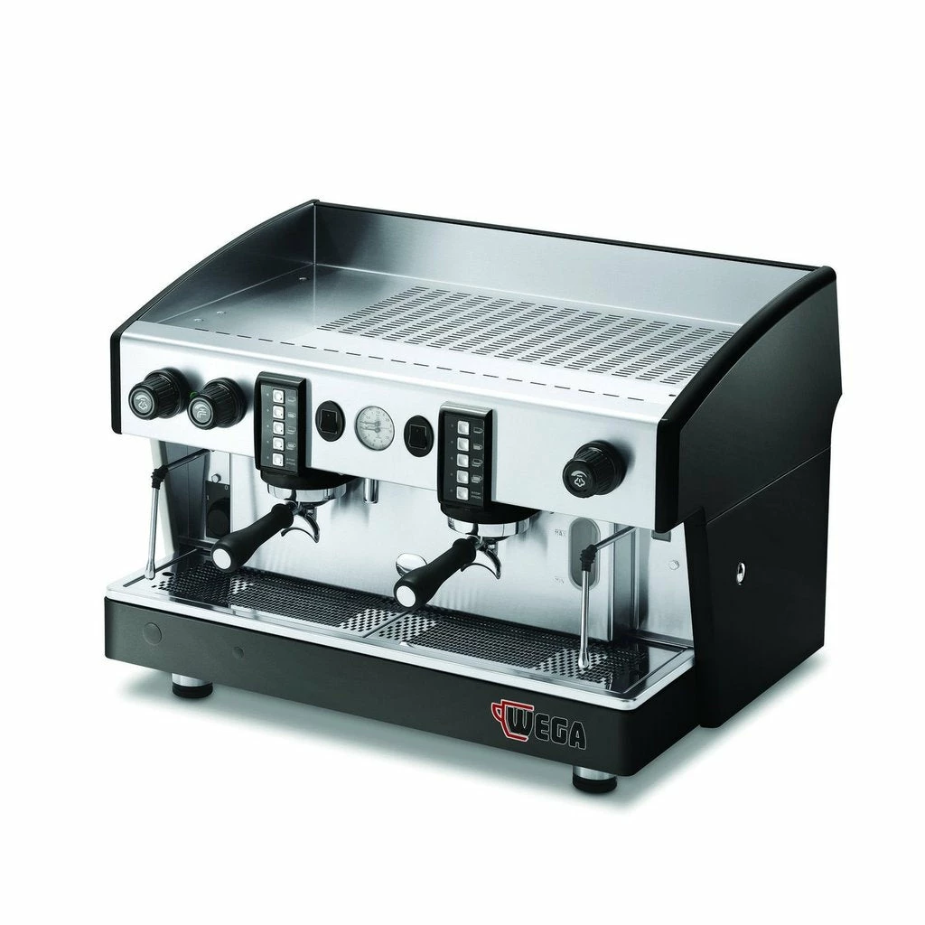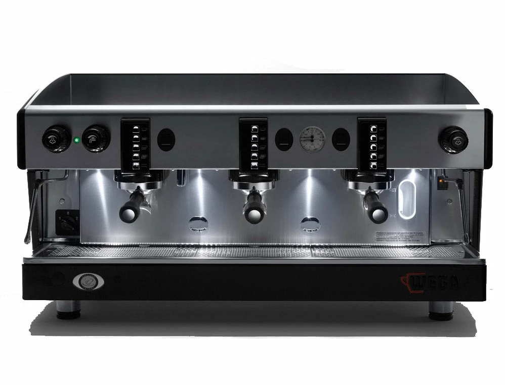 Electronic coffee machine. Four programmable doses per group, with manual brewing button. Two chromed steam wands (single on 1 group model) – one manual hot water tap. Water auto-fill, built in rotary pump.
